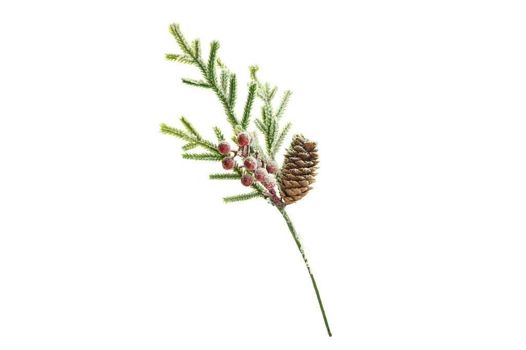 Vánoční větvička s jeřabiny, šiškou a jehličím se zasněženým efektem. Pro tvorbu Vánočních a adventních dekorací se tato větvička řadí jako základní část pro nádherné a poutavé dekorace.Celková délka 30 cmZápich je ohebný díky drátku prečítať celé