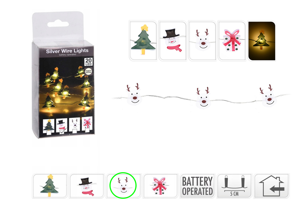 Dekorační řetěz s malými soby, kteří svítí. Vhodné na dekorování věnců, váz, truhlíků a další. Barva světla je teplá bílá. Počet sobů/diod je 20. Délka světelného řetězu je 95cm + 10cm přívodní kabel. Rozestup mezi jednotlivými diodami je 5cm. Napájeno 2xAA baterií (není součástí balení).