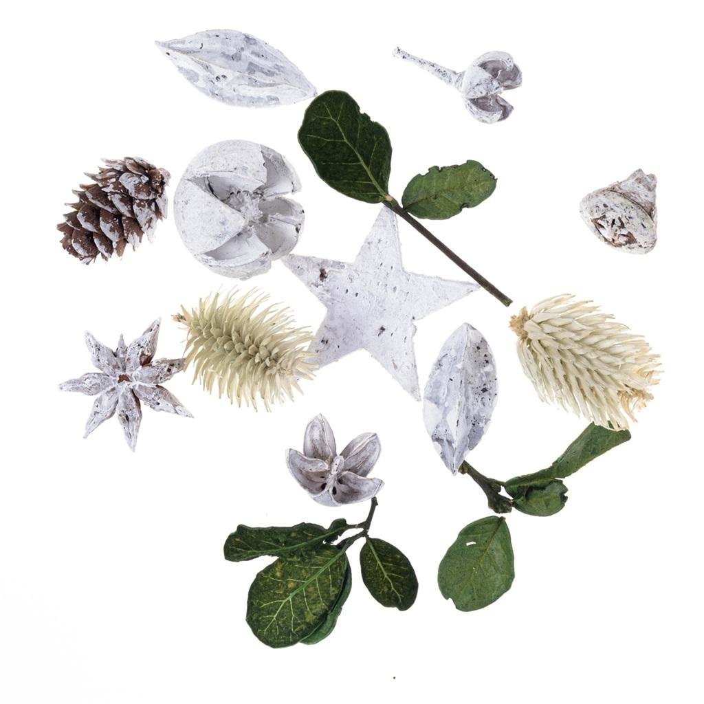 Kompozycja suszonych liści i bielonych owoców egzotycznych. W zestawie znajdują się naturalne liście, szyszki, gwiazdka z kory i egzotyczne owoce pokryte białą farbą.Naturalny susz to świetny dodatek do kartek, albumów i zielników. Wspaniale urozmaici dekoracji na rodzinne przyjęcie i kompozycje...