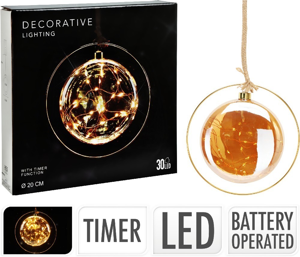 BALL FLAT, GLASS, SIZE: 15X4CM, WEIGHT: 160 GRAM, 30PCS COPPER METAL CABLE, BULB DISTANCE 5CM, GOLD METAL RING DIA 20CM, WITH ROPE LENGTH 80CM, INCLUDING TIMER FUNCTION, 3X AA BATTERIES NOT INCLUDED, COLOUR: AMBER, PACKED IN COLOURBOX/ 212X53X210MM, Colorbox + bubble foil (BBW-C): WEEE / CFT...