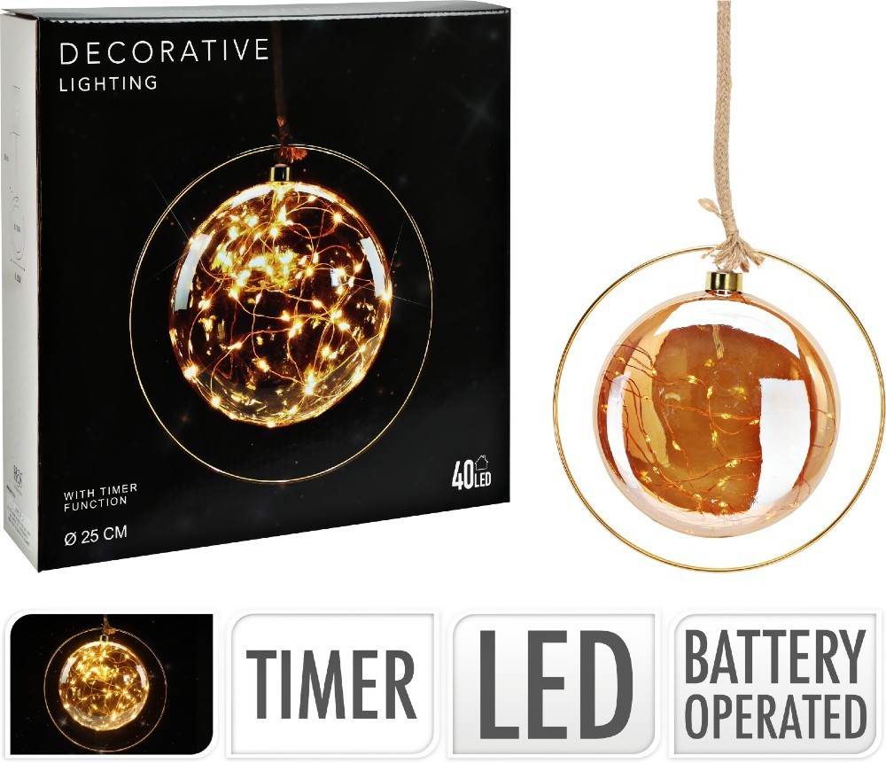 BALL FLAT, GLASS, SIZE: 18X5CM, WEIGHT: 205 GRAM, 40PCS COPPER METAL CABLE, BULB DISTANCE 5CM, GOLD METAL RING DIA 26CM, WITH ROPE LENGTH 80CM, INCLUDING TIMER FUNCTION, 3X AA BATTERIES NOT INCLUDED, COLOUR: AMBER, PACKED IN COLOURBOX/ 265X75X260MM, Colorbox + bubble foil (BBW-C) / CFT...