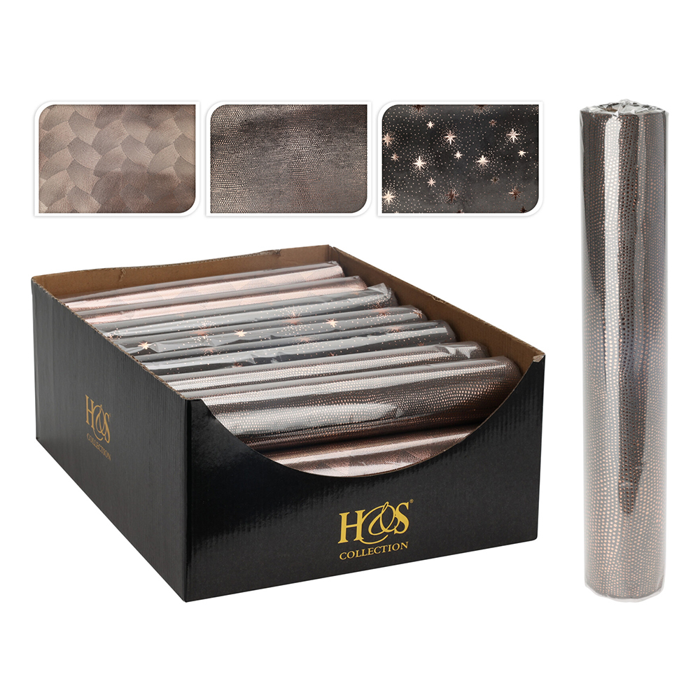 Středový pás v tmavě šedé barvě pro sváteční stolování s lesklou šampaň fólií / 3 vzory.šířka 28 cmnávin 1,5 mMateriál: 100% Polyester s fóliíCena je za 1 kus. prečítať celé