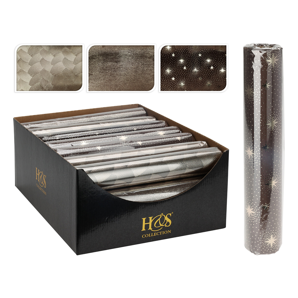 Středový pás v hnedé barvě pro sváteční stolování s lesklou šampaň fólií / 3 vzory.šířka 28 cmnávin 1,5 mMateriál: 100% Polyester s fóliíCena je za 1 kus. prečítať celé