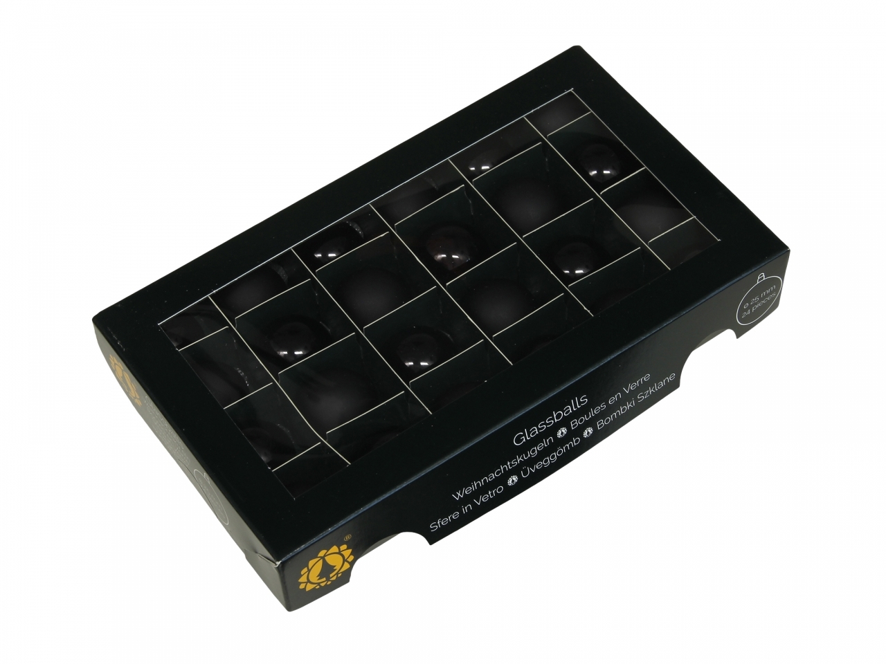 Sada 24 ks skleněných baněk v černé barvě. V sadě jsou namíchané lesklé a matné baňky.Materiál: skloRozměr:průměr 2,5 cm prečítať celé