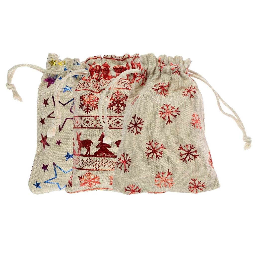 Worek na prezenty wykonany z naturalnego materiału jutowego. Na produkcie znajduje się metalizowany nadruk dekoracyjny z motywami zimowymi. Woreczki wyposażone są w sznurek ściągający umożliwiający zawiązanie. Worek może służyć jako element dekoracyjny lub jako wyjątkowe opakowanie prezentu. Wymiary worka to 14x10 cm. Zestaw 3 sztuk.