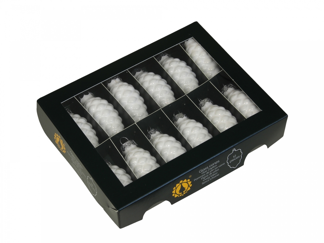Skleněné baňky - šišky 6 cm, bílý opál, sada 12 ks