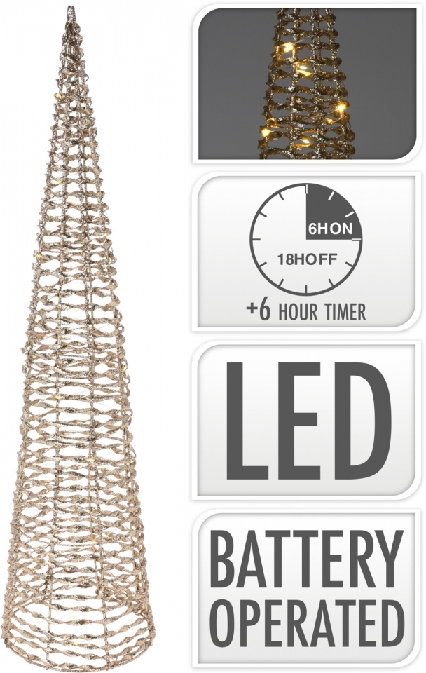 Kovový jehlan s 40 LED diodami teplé bílé barvy a zlatými glitry. Napájení 3x AA bateriemi (nejsou součástí výrobku). Součástí adaptéru časovač 6/18 h.Materiál: kov, plastové glitryRozměry:výška 80 cmprůměr 20 cm prečítať celé