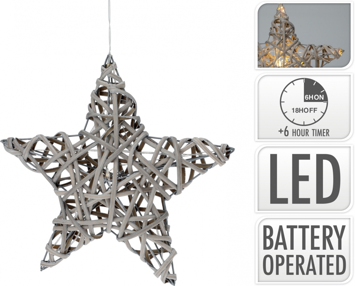 Dekorativní hvězda z umělého ratanu s 10 LED diodami teplé bílé barvy. Napájení 2x AA bateriemi (nejsou součástí výrobku). Součástí adaptéru časovač 6/18 h.Materiál: umělý ratanBarva: šedá pranáRozměry:výška 30 cmšířka 30 cmhloubka 8 cmhmotnost 150 g prečítať celé