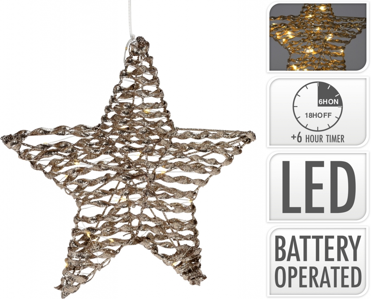 Kovová hvězda se zlatými glitry a 20 LED diodami teplé bílé barvy. Napájení na 2x AA tužkové baterie (nejsou součástí výrobku), délka přívodového kabelu 150 cm. Časovač 6/18 h.Materiál: kov, plastové glitryRozměry:30x30x8 cmhmotnost 180 g prečítať celé