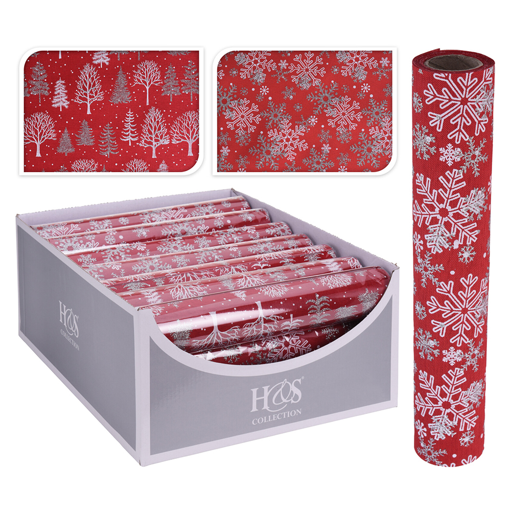 Středový pás v červené barvě pro sváteční stolování s bílo-stříbrným potiskem / 2 vzory (sněhové vločky nebo stromy).šířka 28 cmnávin 2,5 mMateriál: 100% PolyesterCena je za 1 kus. prečítať celé