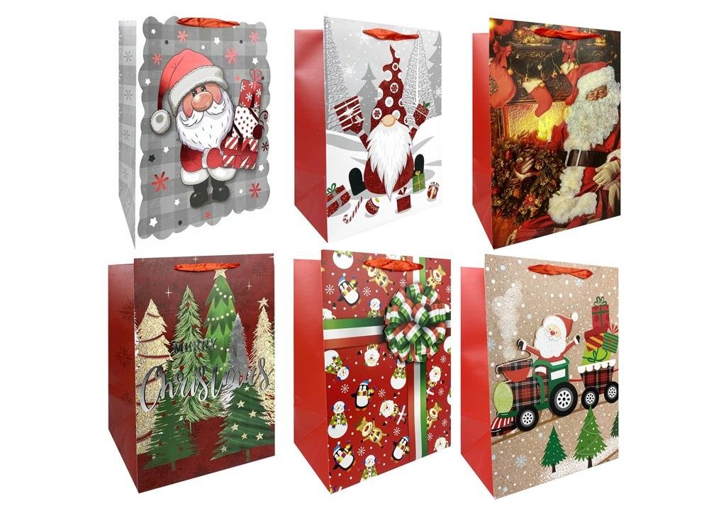 Torebka prezentowa ze świąteczną grafiką. Gramatura papieru 210, torebka laminowana folią mat z dodatkowym uszlachetnieniem (typu brokat/złocenie/srebrzenie/efekt 3D). Pakiet 6 wzorów po 2 sztuki. Wielkość: 300x415x200 mm (L-20) Szerokie dno - 20 cm prečítať celé