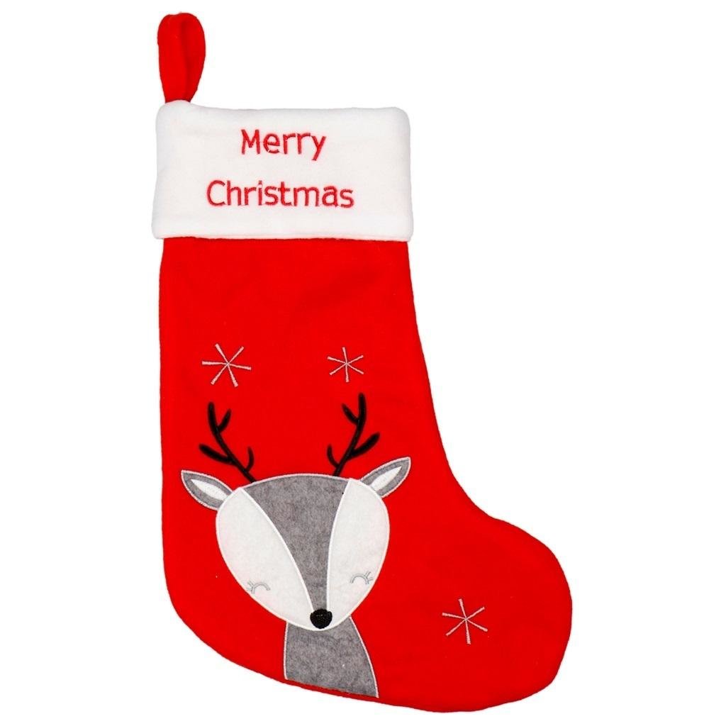 Dekoracyjna skarpeta świąteczna / but na prezenty. Wykonana z przyjemnego i miękkiego materiału. Górna część wykończona białym materiałem z wyszytym napisem. Z przodu tekstylna aplikacja przedstawiająca sarenkę/jelonka.Bardzo gustowna i stylowa.Świetna dekoracja domu w czasie świątecznym, jak również super pomysł na zapakowanie prezentu. Wymiary: 46 x 29 cm.