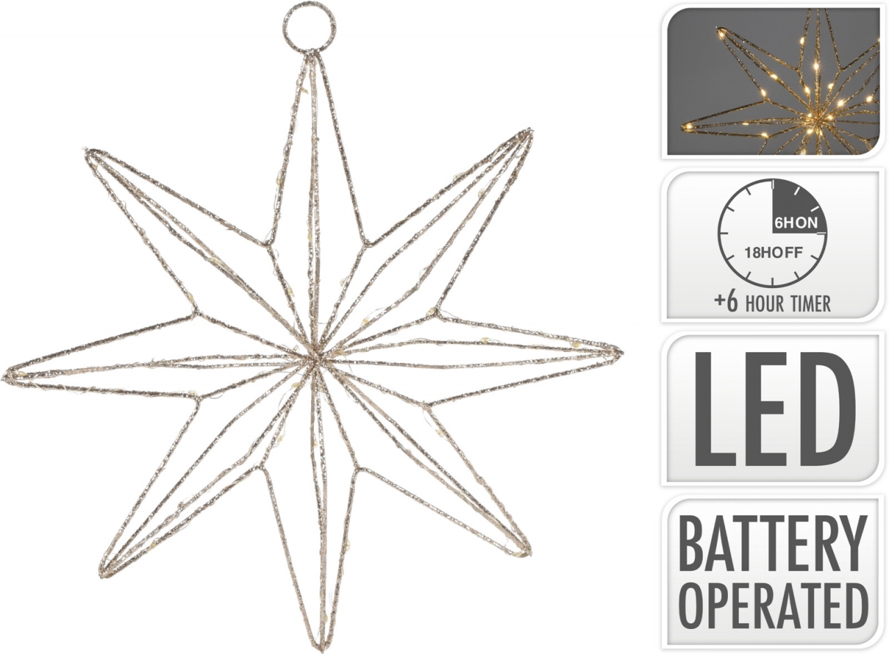 Kovová hvězda se zlatými glitry a 20 LED diodami teplé bílé barvy. Napájení na 3x AA tužkové baterie (nejsou součástí výrobku), délka přívodového kabelu 150 cm. Časovač 6/18 h.Materiál: kov, plastové glitryRozměry:30x30x8 cmhmotnost 120 g prečítať celé
