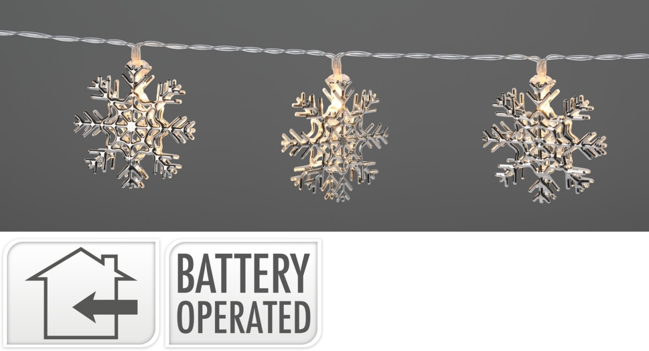 Dekorativní vánoční osvětlení s 10 LED diodami teplé bílé barvy. LED diody jsou ukryty ve sněhových vločkách. Délka přivodového kabelu 30 cm. II. jakost z důvodu jedné chybějící vločky na diodě viz fotografie.Napájení 2x AA tužkové baterie (nejsou součástí výrobku).Možnost použití: v interiéru...