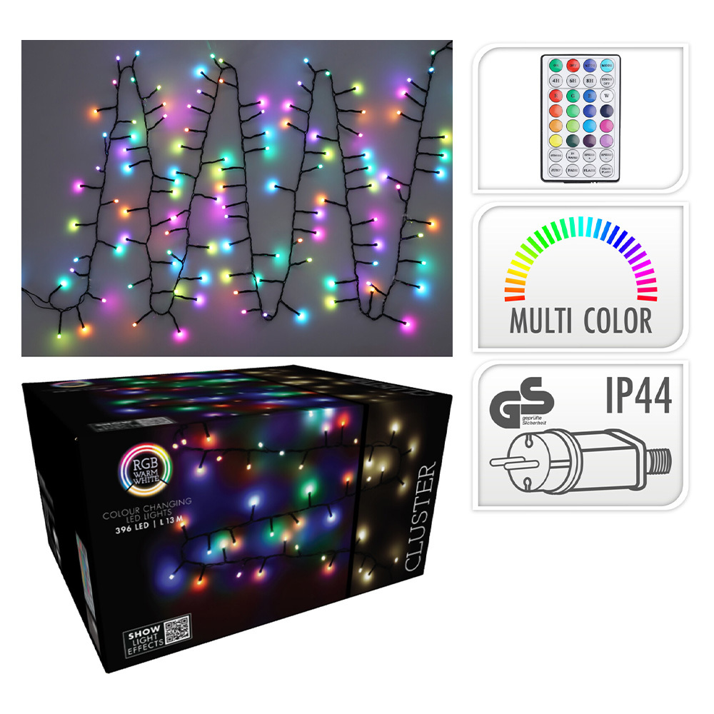 Svítící řetěz obsahuje 396 barevných LED o průměru 5 mm.celková délka řetězu: 19 mdélka přívodního vodiče: 5 mbarva vodičů: zelenározestup mezi jednotlivými LED: 3,3 cmdálkové ovládání IR (vložená baterie CR2025)napájecí adaptér 230V /31V 15Wvhodné pro venkovní i vnitřní použití (krytí IP44)