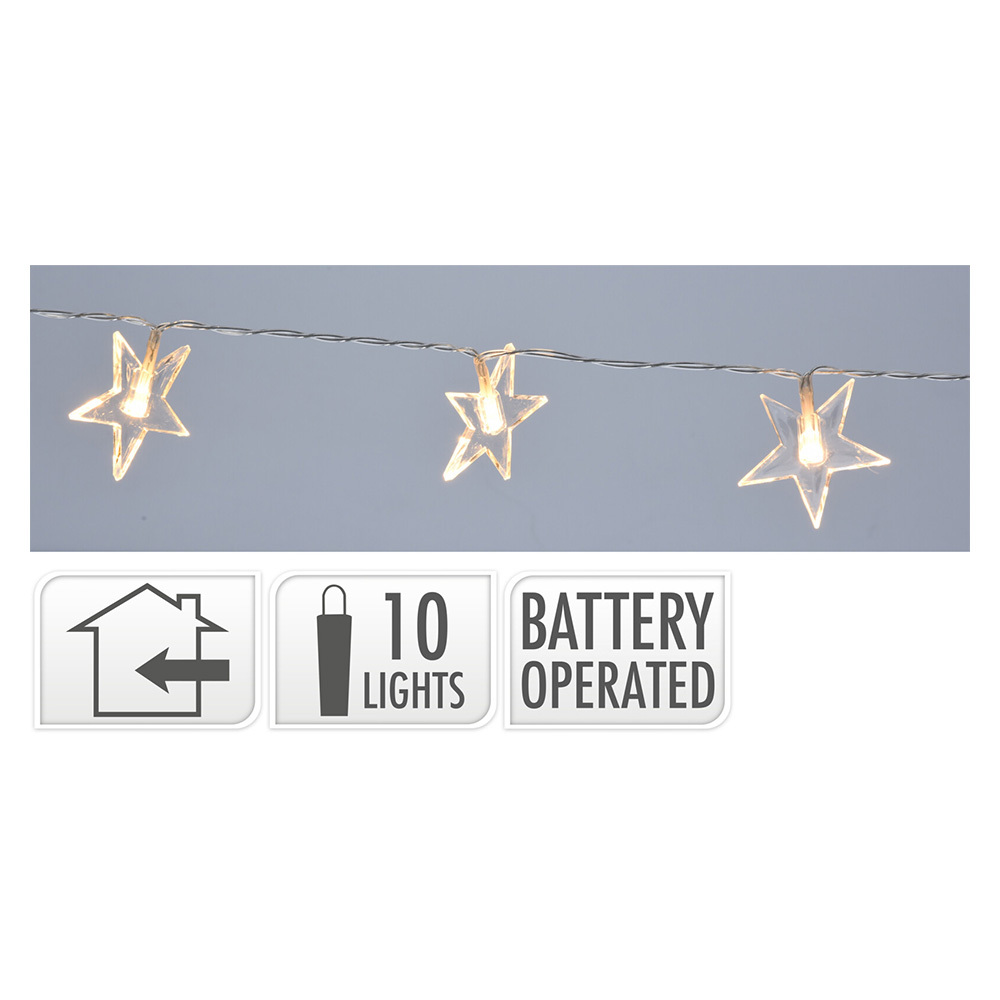 Vánoční dekorační osvětlení obsahuje 10 LED světel ve tvaru hvězdy - teplá bílá. Celková délka šňůry je 165 cm, z toho je 30 cm přívodní šňůra a 135 cm jsou světla. Vzdálenost mezi jednotlivými světly je 15 cm. Průměr hvězdy je 6 cm. Napájení na baterie 2xAA 1,5V, které nejsou součástí balení. Určeno jen do interiéru.