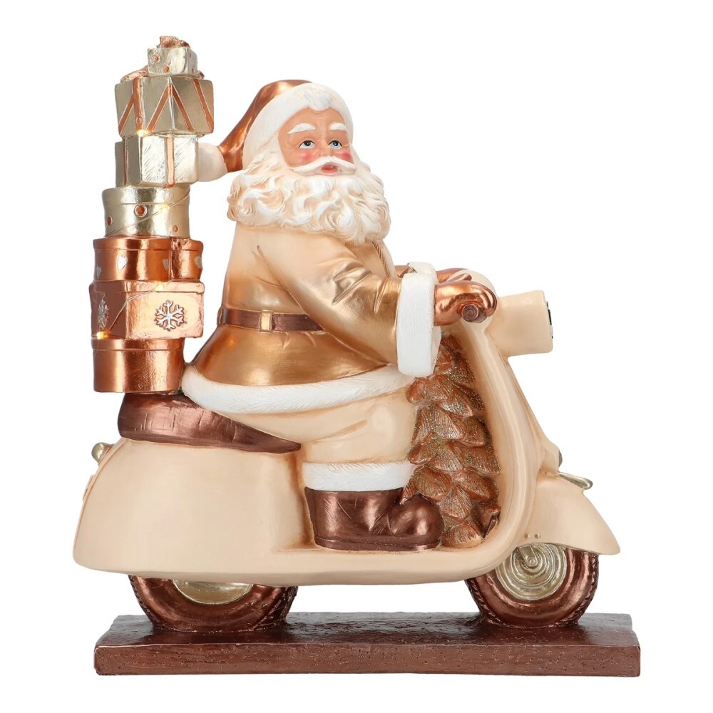 Vánoční dekorace - Santa na skútru s dárky v šampaň zlaté barvě a LED světlem.osvětleny jsou dárky a také svítí přední reflektorbaterie: 2x LR44 (součástí balení)materiál: polyresin, dřevo, plast prečítať celé