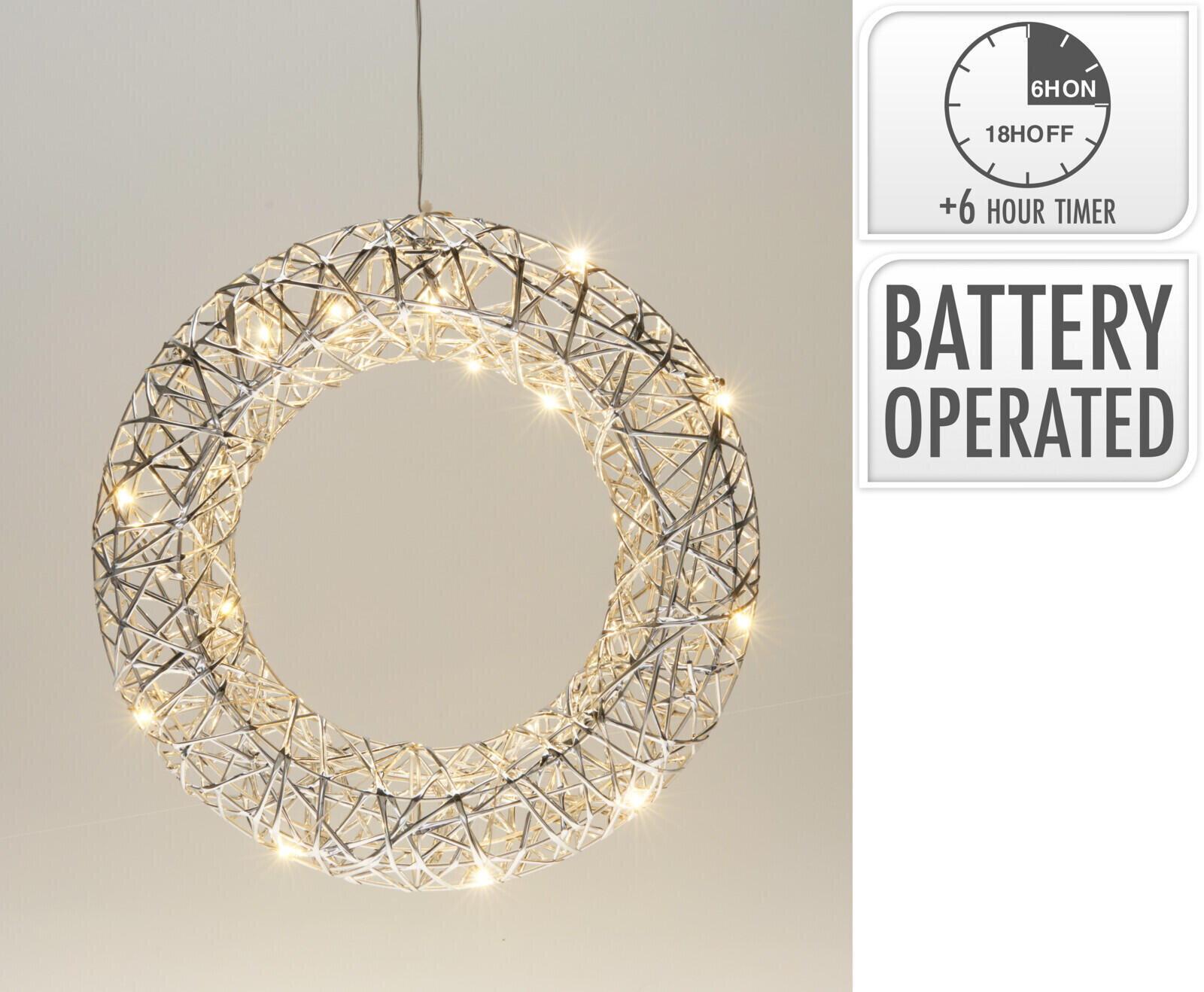 VĚNEČEK S LED, ŽELEZNO, ROZMĚR: 30X7X30CM, S PROUŽKEM PET VE STŘÍBRNÉ BARVĚ, 20X TEPLÁ BÍLÁ MICRO LED, PRŮHLEDNÝ VÝVODOVÝ DRÁT 150CM, VZDÁLENOST ŽÁROVKY 10CM, IP20, NAPÁJENÝ NA BATERIE, 20X BATERIE, NEPOUŽÍVEJTE 20 VN. TIMER/ 300X70X300MM, Opp taška s visačkou (OPPH5): WEEE