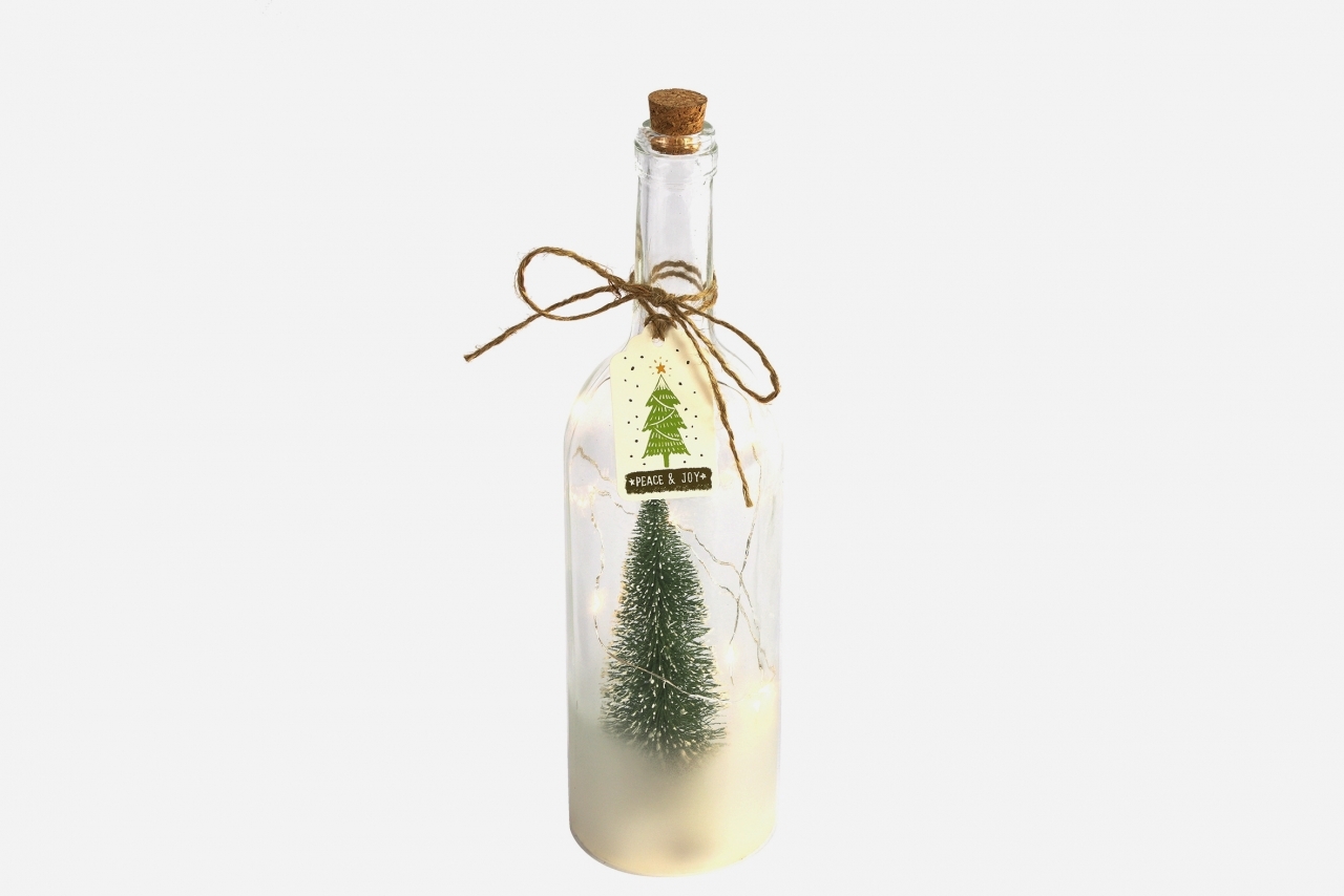 Vánoční lahev z čirého skla s korokovým uzávěrem. Uvnitř lahve LED osvětlení na drátku s časovačem a stromeček. Funkce časovače: 6 hoodin svítí, 18 hod. nesvítí.Materiál: sklo, korek, kovRozměry:výška 33 cmprůměr 9 cm prečítať celé