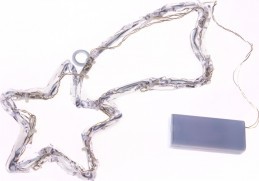 Vánoční bateriová světelná LED dekorace do okna ve tvaru komety s 10 LED diodami s chladným 25 x 10 cm a s celkovým příkonem úsporného zdroje 0,36 W je napájena 2 x AA 1.5 V bateriemi. Kabely jsou v čiré barvě. Krytí má hodnotu IP20 pro interiérové použití.