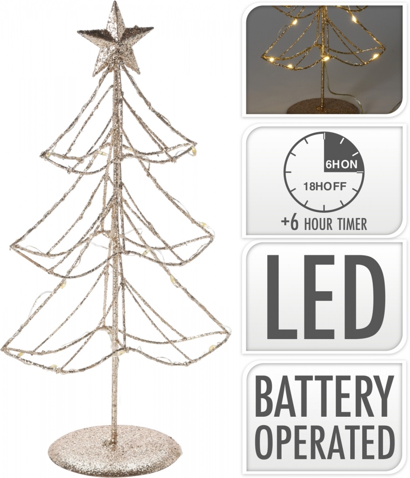 Kovový strom se zlatými glitry a 15 LED diodami. Napájení na 2x AA tužkové baterie (nejsou součástí výrobku). Součástí adaptéru je časovač 6/18 h.Materiál: kov, plastové glitryRozměry:výška 30 cmprůměr 15 cmhmotnost 115 g prečítať celé