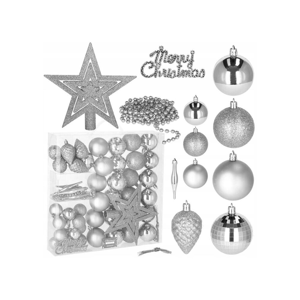 Luxusní 53 dílná sada vánočních ozdob na stromeček. Set tvoří 9 různých vzorů ozdob stříbrné barvy + kouzelné hvězdy na špičku stromku a 2 m girlanda. Vše z nerozbitného plastového materiálu. Ideální k výzdobě stromečku nebo jako vánoční dekorace. Zdarma stříbrné provázky pro snadné zavěšení.