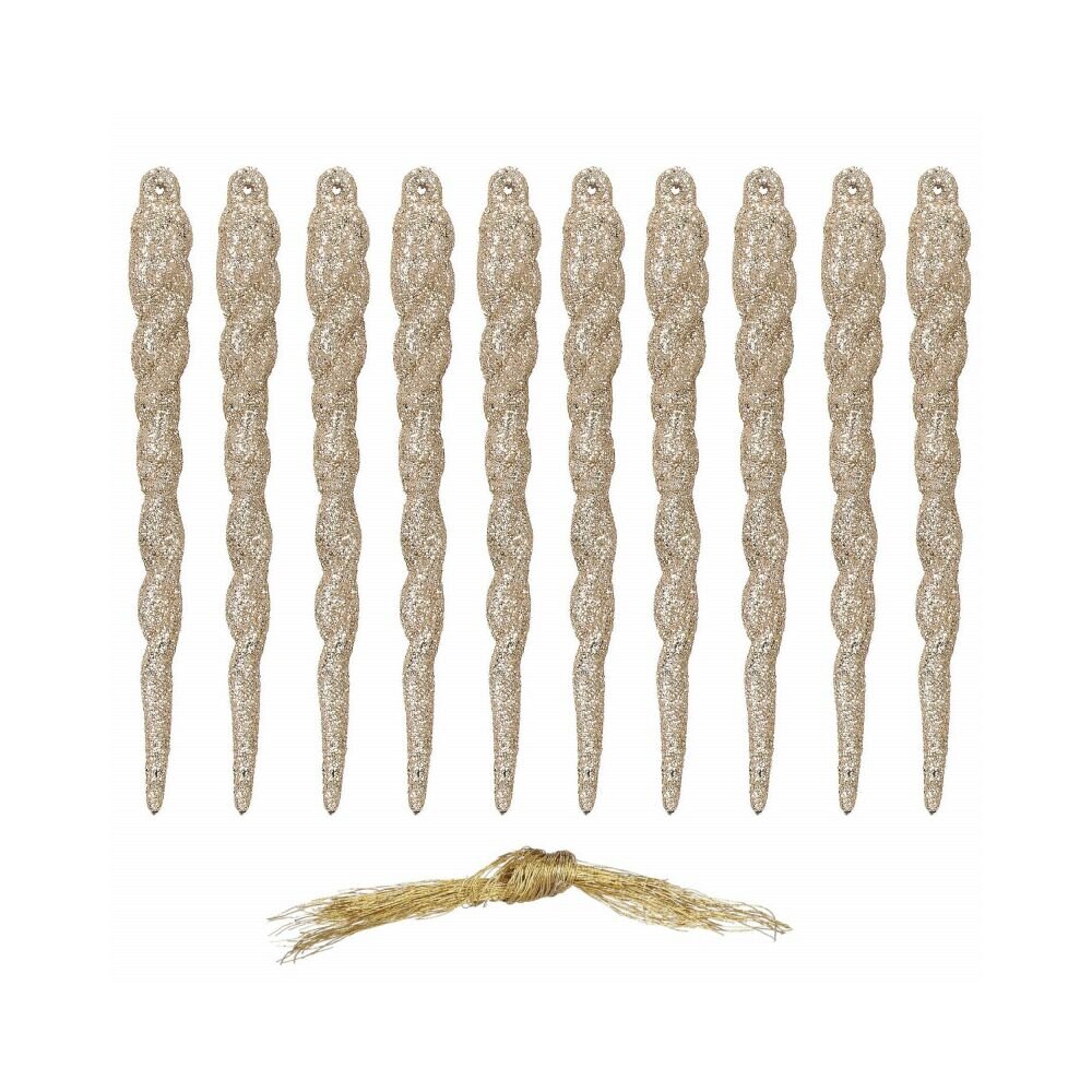 Sada 10ks zlatých rampouchů s provázkem na zavěšení. Výška 12 cm, nerozbitný, odolný materiál, třpytivý vzhled. Ideální k výzdobě stromečků nebo jako vánoční dekorace. prečítať celé