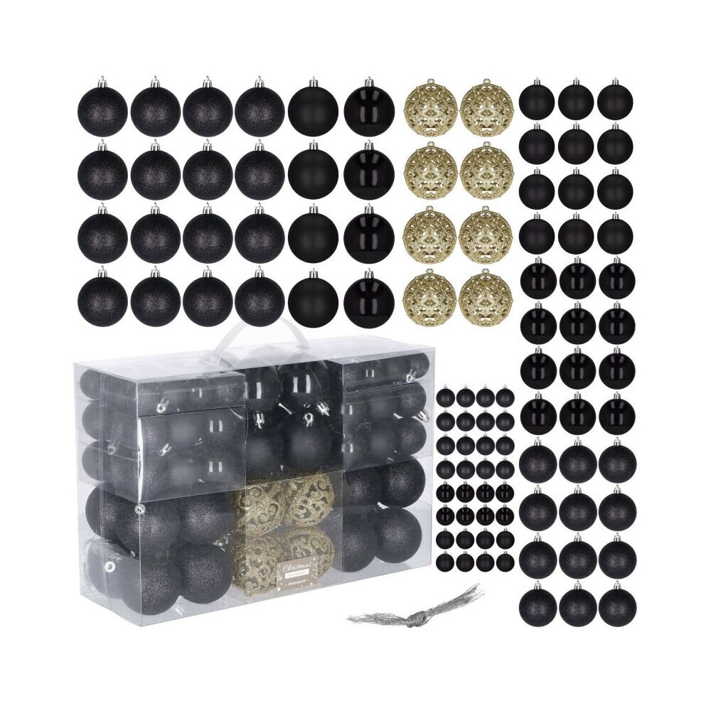 Luxusní 100-dílná sada vánočních baněk na stromeček. Set tvoří 4 různé vzory a 3 různé velikosti baněk černé a zlaté barvy. Vše z nerozbitného plastového materiálu. Ideální k výzdobě stromečku nebo jako vánoční dekorace. Zdarma provázky pro snadné zavěšení.Luxusní kolekce vánočních baněkSada...