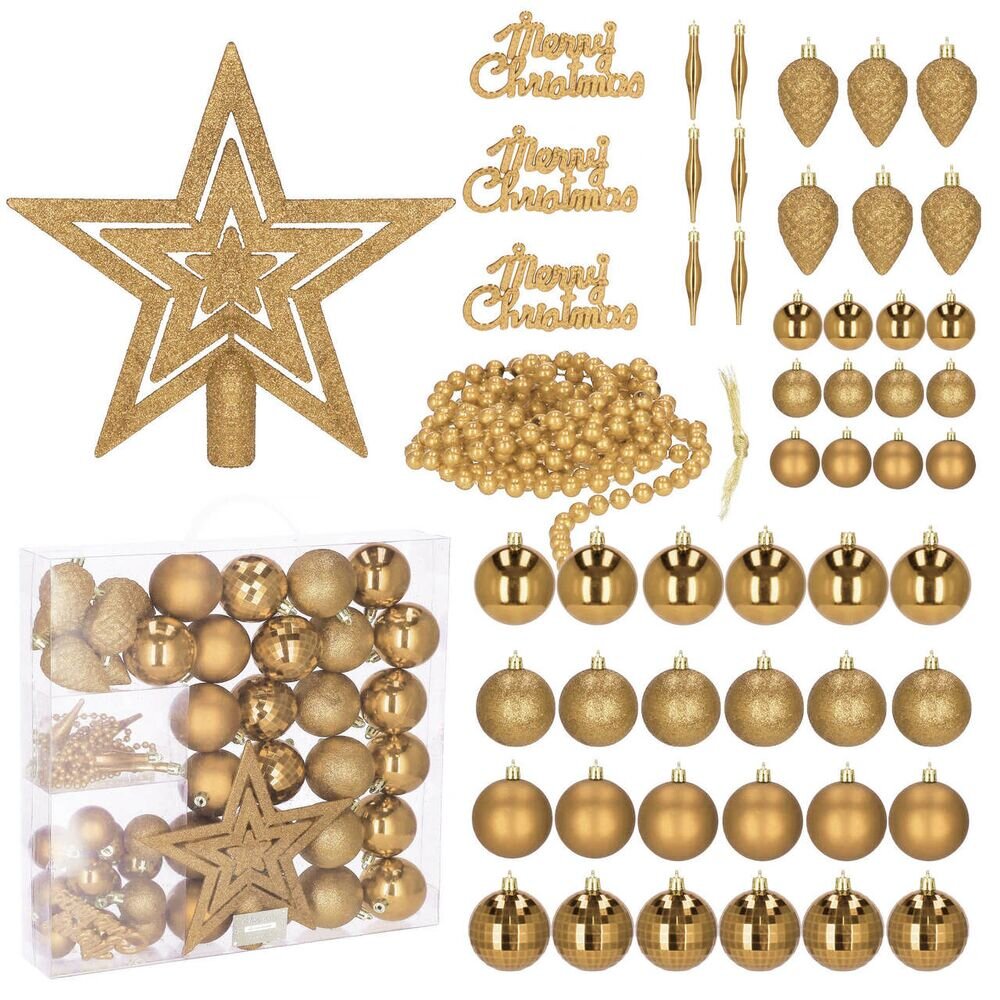 Luxusní 53 dílná sada vánočních ozdob na stromeček. Set tvoří 9 různých vzorů ozdob zlaté barvy + překrásná hvězda na špičku stromku a 2 m girlanda. Vše z nerozbitného plastového materiálu. Ideální k výzdobě stromečku nebo jako vánoční dekorace. Zdarma provázky pro snadné zavěšení.