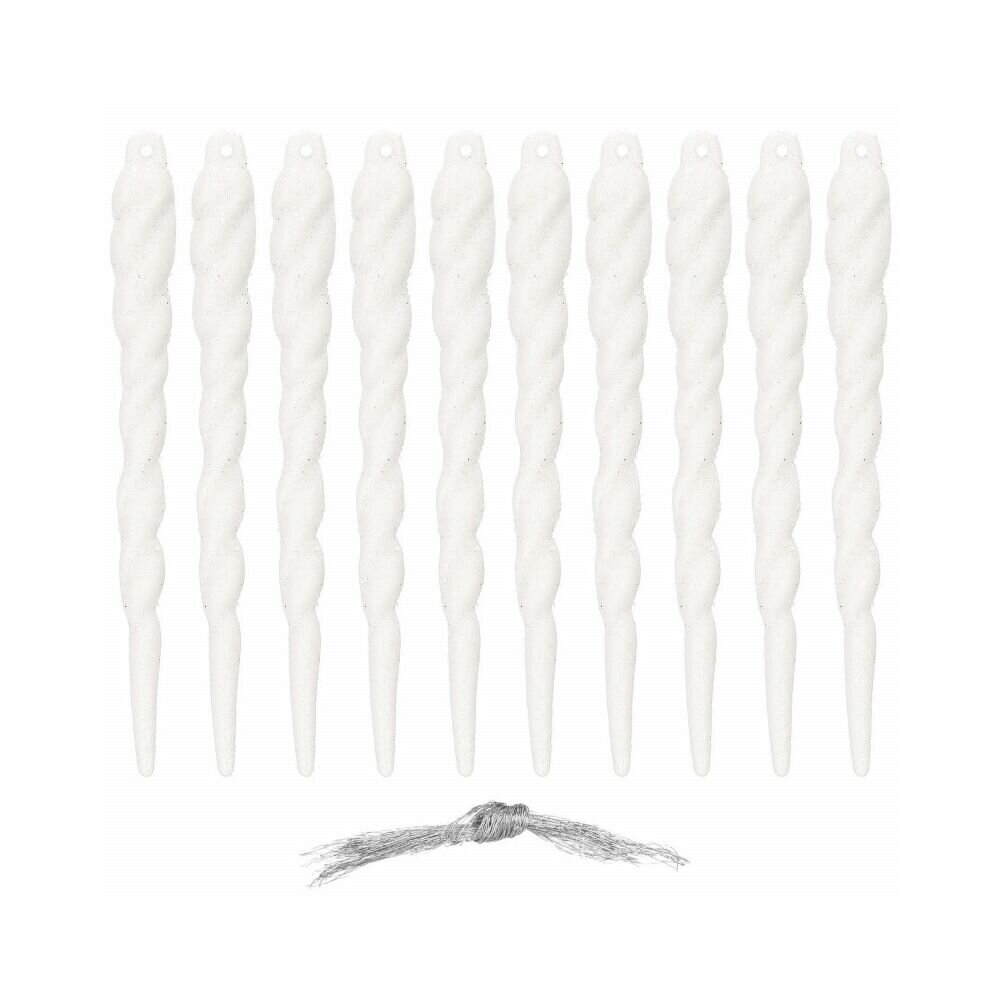 Sada 10ks bílých rampouchů s provázkem na zavěšení. Výška 12 cm, nerozbitný, odolný materiál, třpytivý vzhled. Ideální k výzdobě stromečků nebo jako vánoční dekorace.