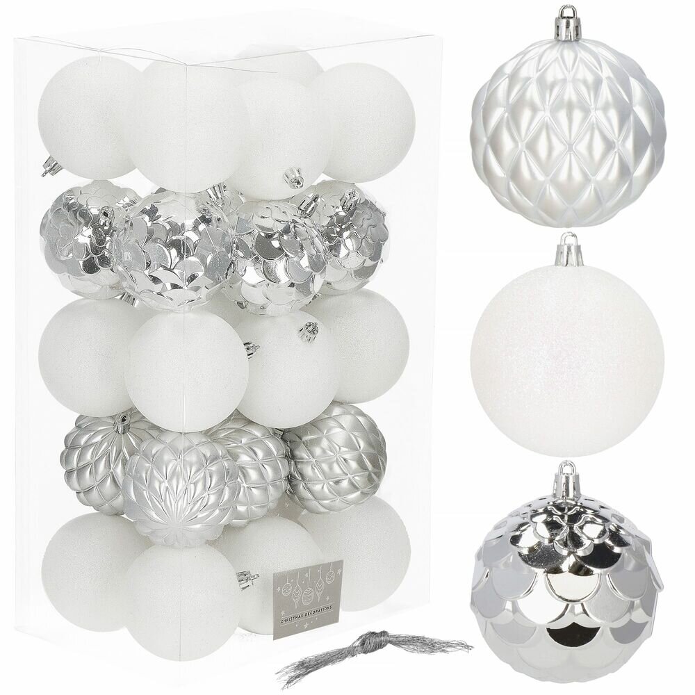 Sada 30 ks bílo-stříbrných baněk na stromeček se čtyřmi různými vzory. Průměr baňky 8 cm, poutko na zavěšení, nerozbitný plastový materiál. Decentní ozdoby na stromeček nebo jako vánoční dekorace k dotvoření vánoční atmosféry. Zdarma provázky pro snadné zavěšení. prečítať celé