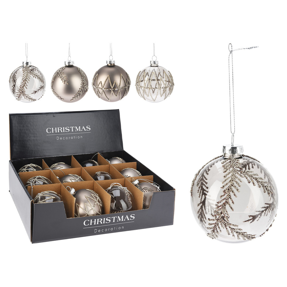 Vánoční koule s glitrovaným dekorem stříbrné barvy (4 varianty).průměr ozdoby: 8 cmčepička a šňůrka stříbrné barvy2x transparentní - dekorovaná / 2x matná šedá - dekorovanámateriál: sklovariantu vyberte v poli nad cenovkouCena je za 1 kus. prečítať celé
