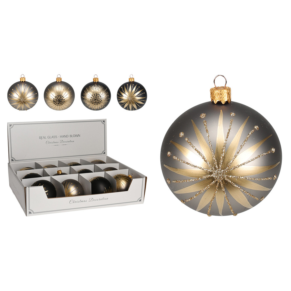 Vánoční koule skleněná 80 mm šedá / černá, glitrovaná (4 designy) cena za 1 ks