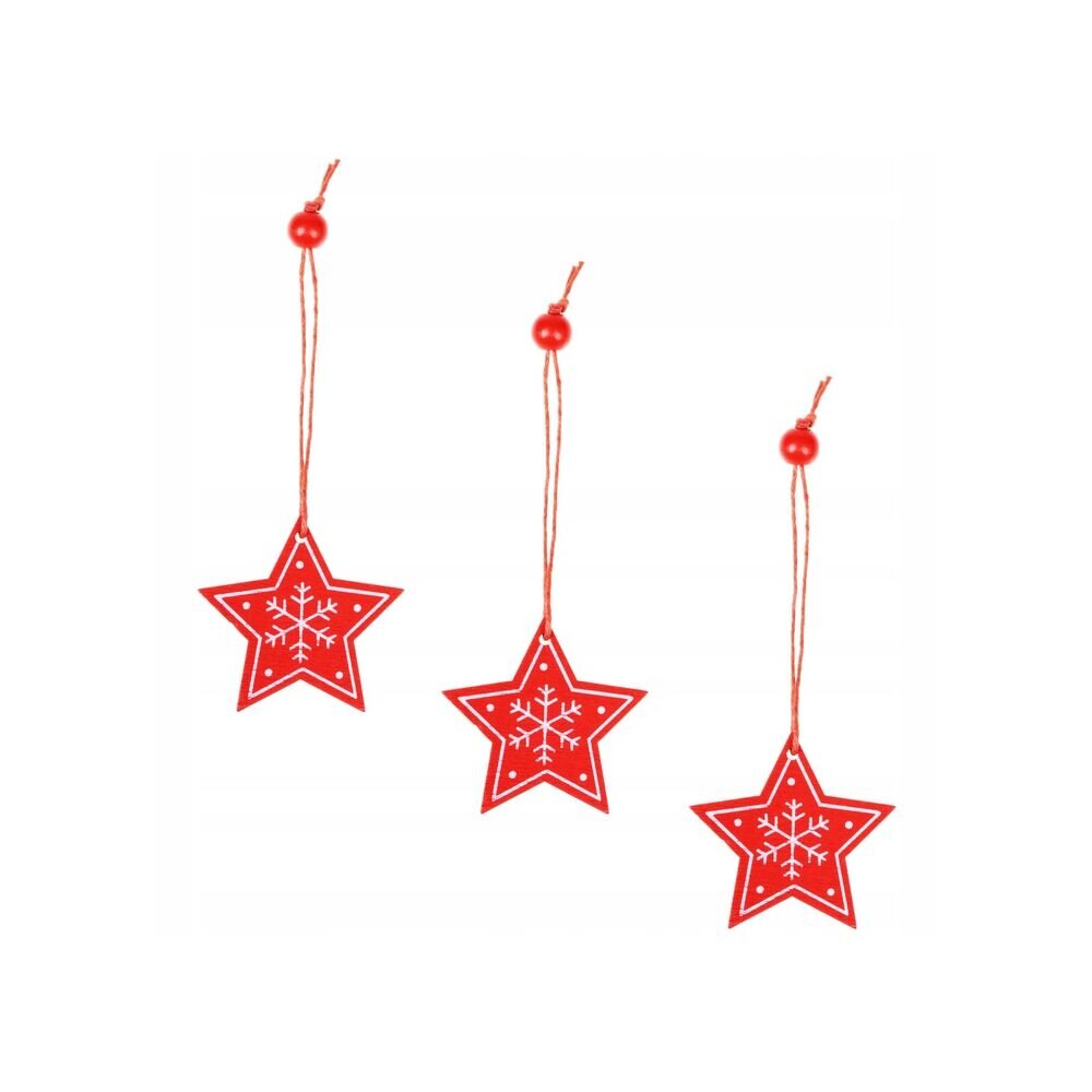 Sada tří kusů dřevěných hvězd s bílými vločkami a provázkem na zavěšení. Výška 4,5 cm, přírodní materiál. Ideální k výzdobě stromečků nebo jako vánoční dekorace.