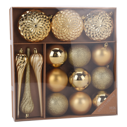 Sada vianočných ozdôb (15 ks):- 9 ks vianočné gule 60 mm (3 lesklé, 3 matné, 3 s trblietkami)- 3 ks vianočná ozdoba 80 mm (2 lesklé a 1 matná)- 3 ks vianočné cencúle 170 mm (matný, lesklý, s trblietkami)Farba: zlatá. prečítať celé