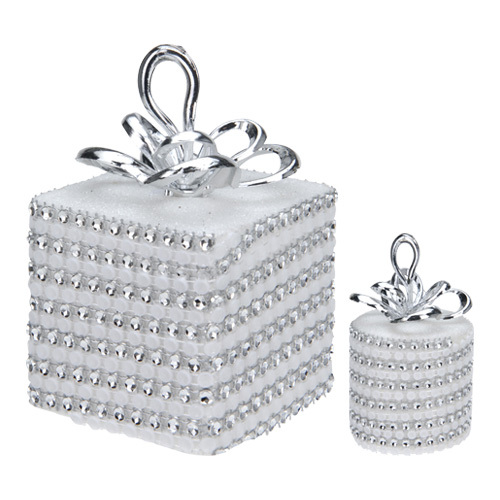 Vánoční dekorace ve tvaru dárečku, bílá, zdobená lesklými stříbrnými kuličkami. Ozdobu lze použít jako závěsnou ale i stojatou dekoraci. prečítať celé