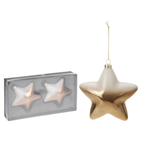 Vánoční skleněná ozdoba ve tvaru hvězdy, závěsná. V balení po 2 kusech. V efektním dvoubarevném, bílo / zlatém provedení. Hladká, bez zdobení. Velikost 1 kusu 100mm Klasická závěsná ozdoba na Váš vánoční stromeček. prečítať celé
