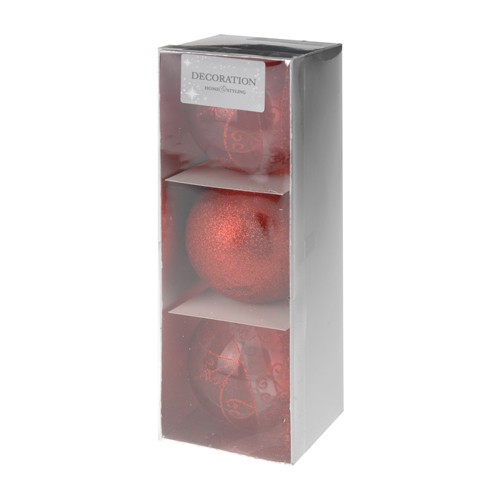 Vianočná závesná ozdoba, vyhotovená z pevného PP materiálu. V červenej farbe/mix - hladká, leská s trblietkami. Priemer ozdoby 80mm. Praktické, nerozbitné, napriek tomu s luxusným vzhľadom. Sada obsahuje 3 ks. Materiál: plast. prečítať celé