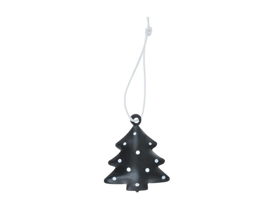 Vánoční plechová dekorace stromek v černé barvě s bílými puntíky a závěsem.Tato vánoční ozdoba je opatřena očkem a provázkem na zavěšení. Můžete použít na ozdobení vánočního stromečku, zavěsit na dveře, okno a zkrášlit tak Vaše bydlení.