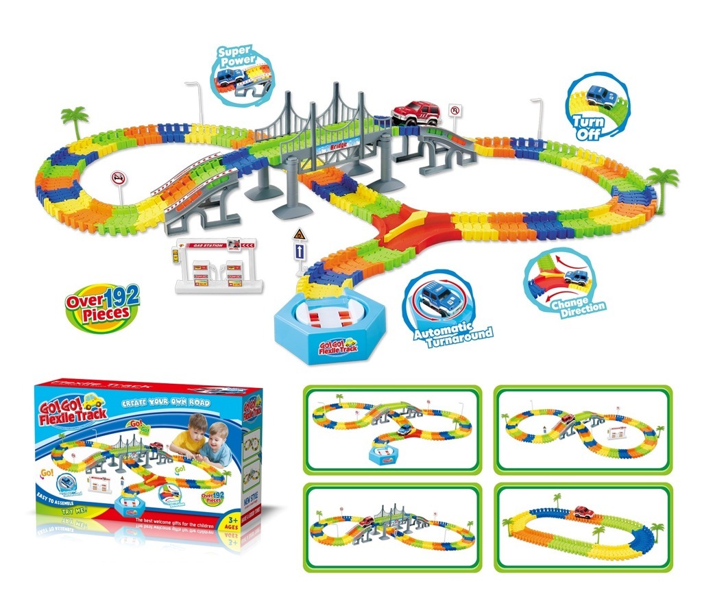 Variabilní dráha 192 dílů s točnou. Součástí jedno autíčko, lanový most a točna, která autíčko automaticky otočí zpět na dráhu. Provoz na 2×1,5V AA tužkové baterie – nejsou součástí. V nabídce červené/modré autíčko. Jednoduché na sestavení. prečítať celé