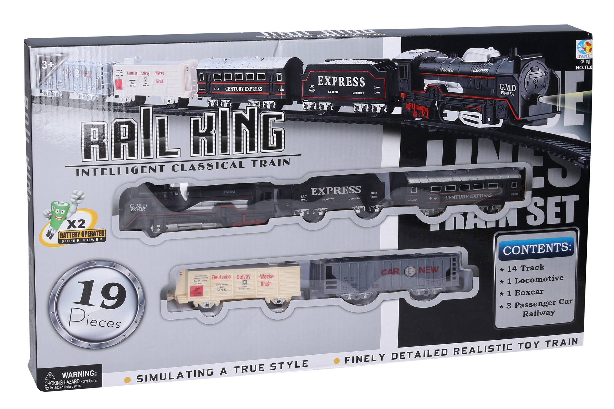 Vlak set. Délka trati 210 cm. Součástí mašinka, 4 vagóny, 4 rovné kolejnice, 10 zahnutých kolejnic. Velikost mašinky 13 cm, vagónů 10-13 cm. 2xAA baterie do mašinky nejsou součástí. Přepínač ON/OFF na pravé straně mašinky. prečítať celé