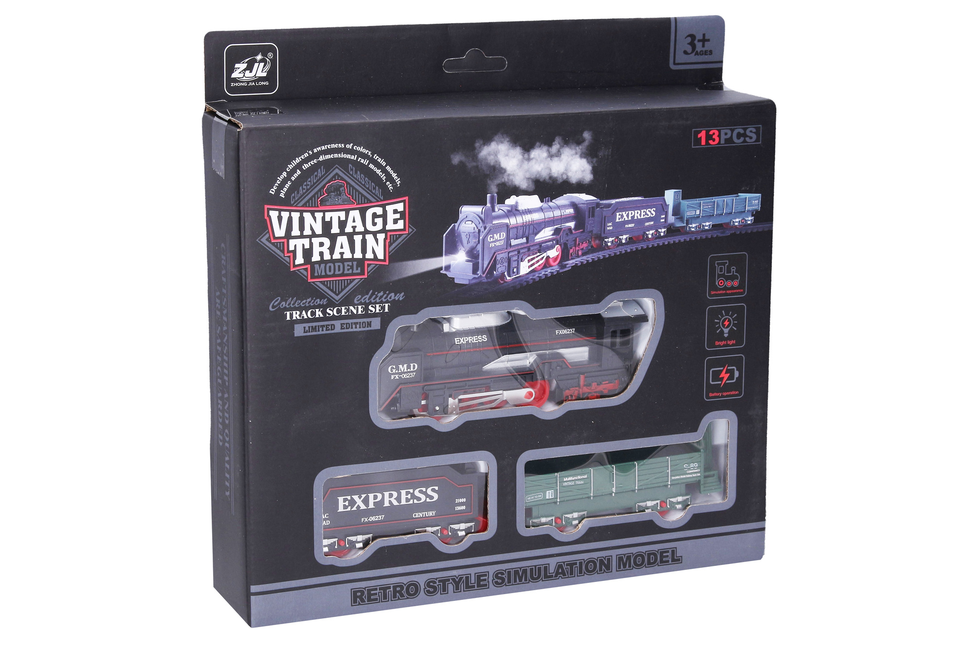 Vlak set. Rozměry železnice 68x68 cm, velikost mašinky 13 cm, vagónů 9-11 cm. Součástí mašinka, 2 vagóny. Světelné efekty. 2xAA baterie nejsou součástí. Přepínač ON/OFF na pravé straně mašinky. prečítať celé