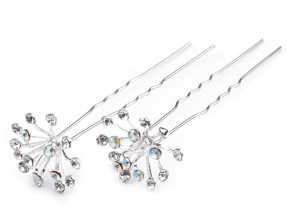 Elegantní vlásenky Ø20mm, které každý účes povýší nejméně o dvě třídy výš. Délka vlásenky 65mm je bez ozdoby, ozdoba má výšku 10mm. Kamínky jsou skleněné, broušené, takže se na slunci i umělém světle budou jemně blýskat, což výsledný dojem ještě umocní. Ozdobí společenské účesy i nevěsty v jejich den...