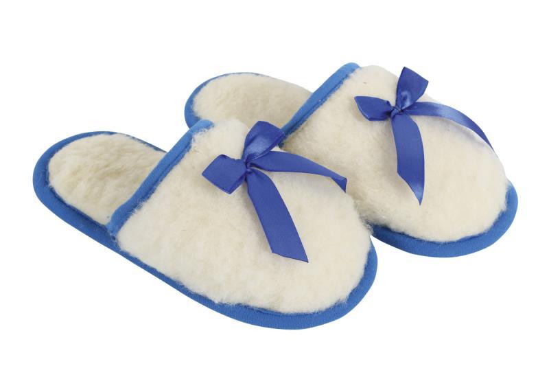 Australské meríno pantofle 520g/m2 - bílý beránek/modrá stuha - velikost 37-38