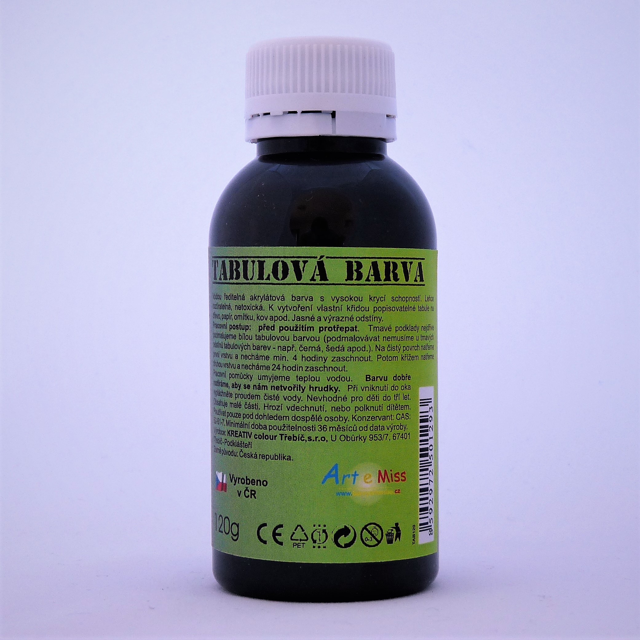 Tabulová barva ARTEMISSSVodou ředitelná akrylátová barva s vysokou krycí schopností. Lehce roztíratelná, netoxická. K vytvoření vlastní křidou popisovatelné tabule na dřevo, papír, omítku, kov apod. Jasné a výrazné odstíny.Pracovní postup:tmavé podklady nejdříve podmalujeme bílou tabulovou...