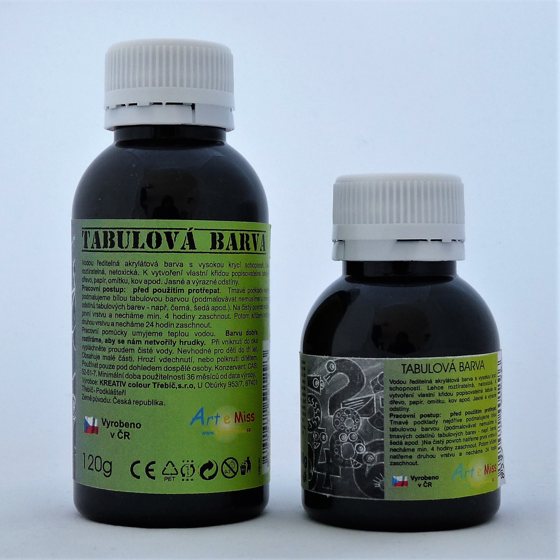 Tabulová barva ARTEMISSSVodou ředitelná akrylátová barva s vysokou krycí schopností. Lehce roztíratelná, netoxická. K vytvoření vlastní křidou popisovatelné tabule na dřevo, papír, omítku, kov apod. Jasné a výrazné odstíny.Pracovní postup:tmavé podklady nejdříve podmalujeme bílou tabulovou...