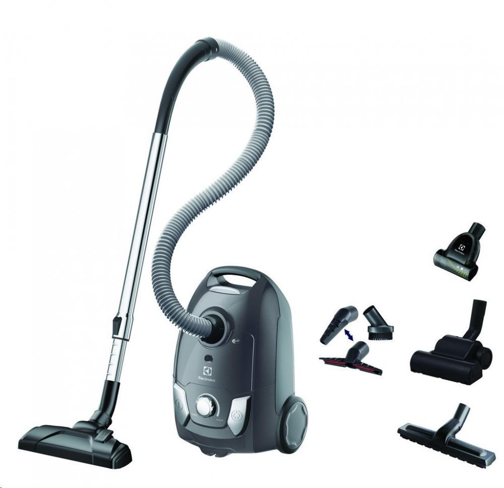 Sáčkový vysavač Easy Go, příkon 650 W. Hubice DustPro™ pro efektivní hloubkové čištění, turbo hubice, hubice na tvrdé podlahy, mini turbokartáč, mechanický indikátor plného prachového sáčku, regulace výkonu, měkčená kolečka, teleskopické trubky, omyvatelný hygienický filtr 12, délka přívodního kabelu 5m, akční rádius 7,5 m. Integrované příslušenství (štěrbinová hubice, hubice na čalounění + kartáček). Barva metalická šedá