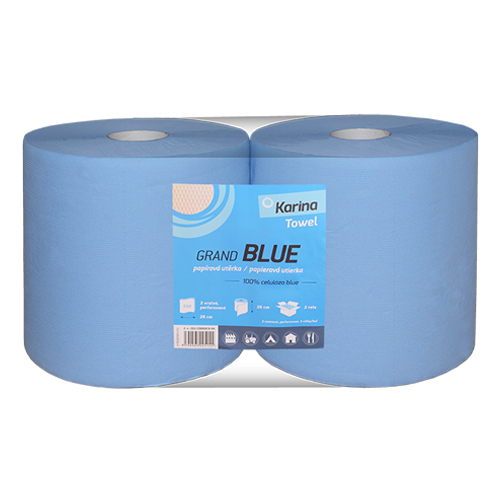 Priemyselná, extra pevná, dvojvrstvová, modrá papierová utierka v rolke Karina GRAND BLUE s vysokou absorbčnou schopnosťou. Materiál: 100% celulóza. Návin 230 m, priemer rolky 264 mm. Balenie obsahuje 920 útržkov. Vďaka veľkým útržkom je určená predovšetkým do gastro zariadení, servisov a dielní. Balenie obsahuje 2 ks.