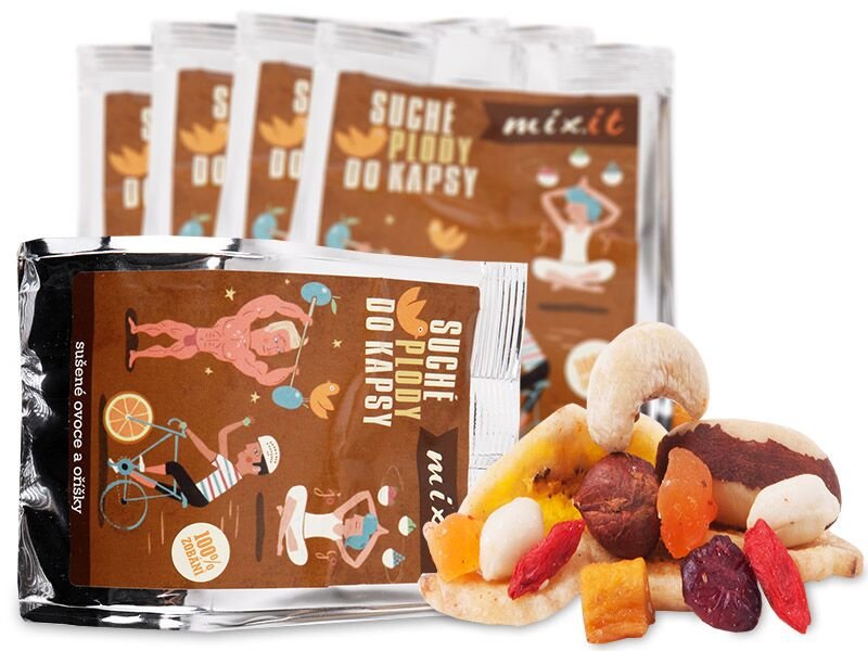 Mix ovoce a oříšku výborně padnoucích do každé kapsy, baťohu či kabelky.Složení:jádra lískových ořechů, jádra mandlí, medový banán (banán 58 %, kokosový olej, cukr, banánové aroma, med 0,02 %), klikva (klikva "brusinka kanadská" 65 %, cukr, slunečnicový olej), arašídy, jádra kešu ořechů, goji,...