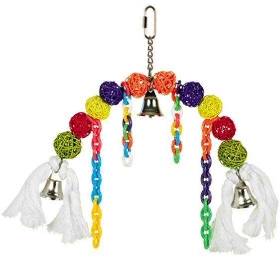 aktivní hračka k zavěšení do klece pro andulky i papoušky připevňuje se snadno ke kleci, pomocí háčku se šroubovacím zavíráním hračka obsahuje: plast, bavlnu, sisalová vlákna, proutěné míčky a zvoneček Upozornění: Pravidelně produkt kontrolujte, zda není poškozen a nahraďte jej, pokud objevíte závažnější poškození - jinak nelze vyloučit zranění zvířete.